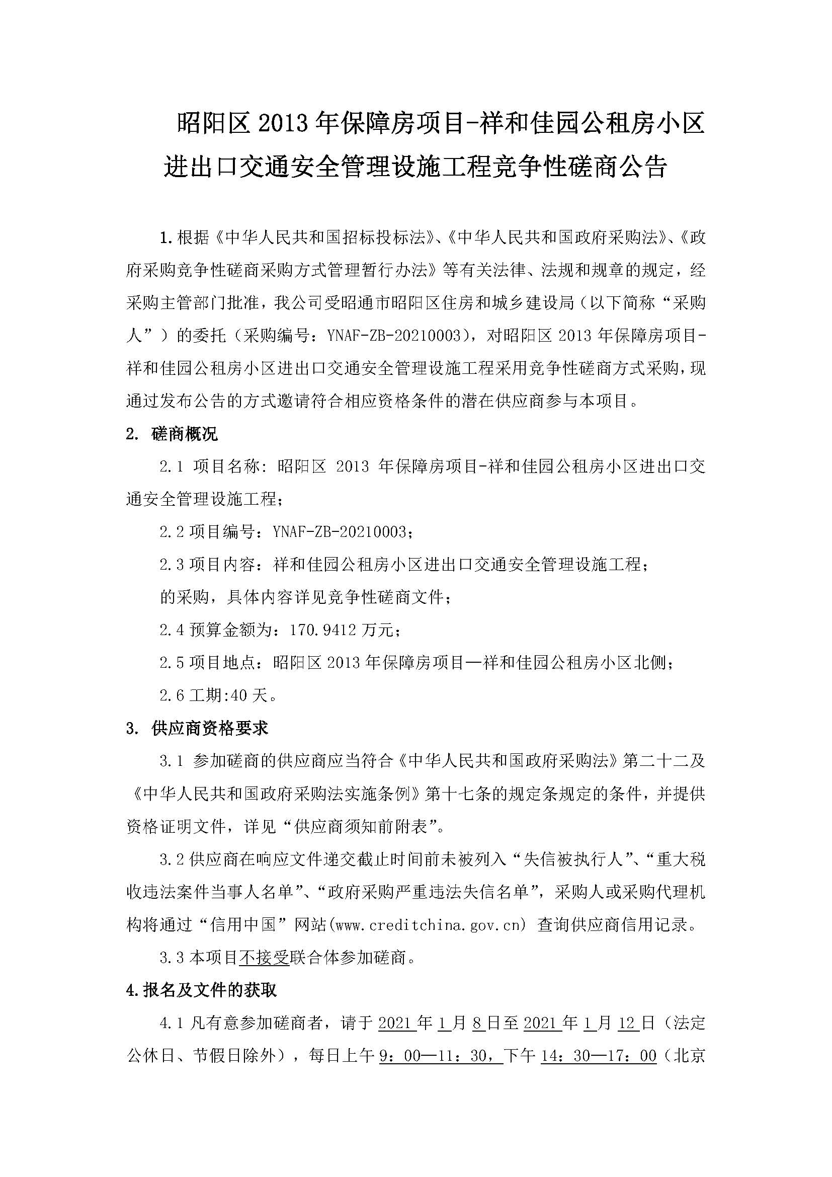 昭陽區(qū)2013年保障房項目-祥和佳園公租房小區(qū)進出口道路-路燈工程競爭性磋商公告