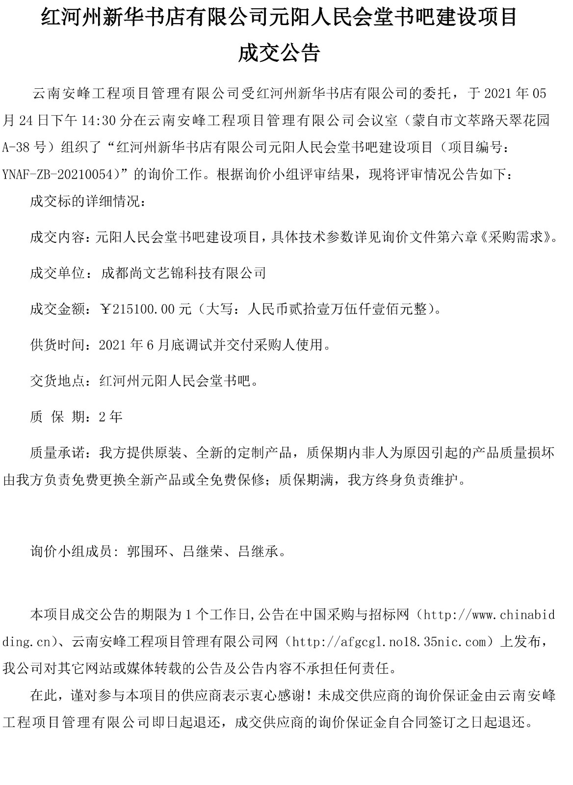 紅河州新華書店有限公司元陽人民會堂書吧建設(shè)項目成交公告