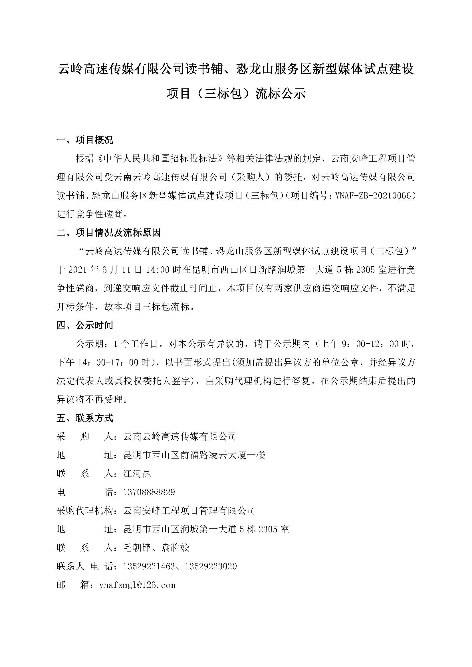 云嶺高速傳媒有限公司讀書鋪、恐龍山服務(wù)區(qū)新型媒體試點(diǎn)建設(shè)項(xiàng)目(三標(biāo)包)流標(biāo)公示