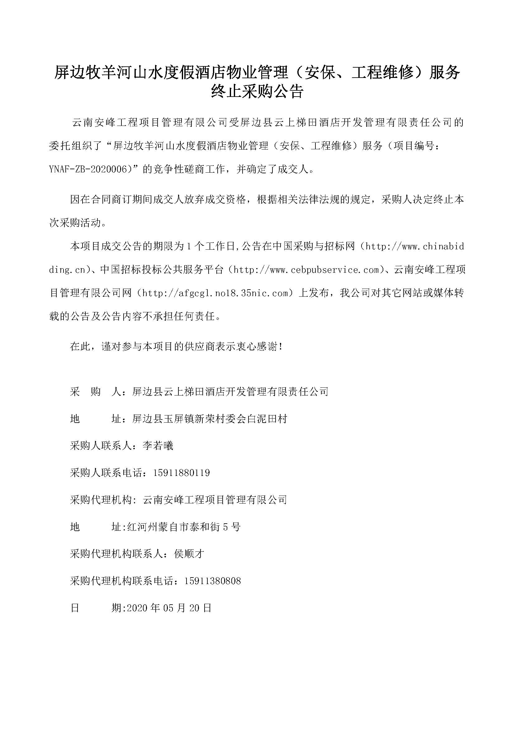 屏邊牧羊河山水度假酒店物業(yè)管理(安保、工程維修)服務(wù) 終止采購(gòu)公告
