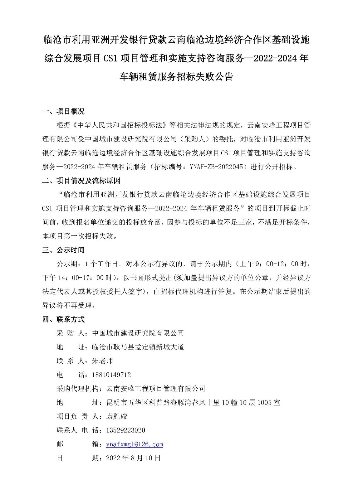 臨滄市利用亞洲開發(fā)銀行貸款云南臨滄邊境經(jīng)濟合作區(qū)基礎設施綜合發(fā)展項目CS1項目管理和實施支持咨詢服務—2022-2024年車輛租賃服務招標失敗公告