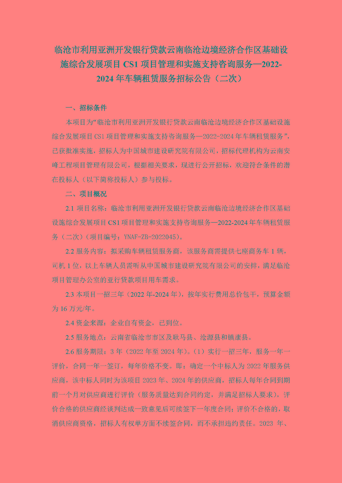 臨滄市利用亞洲開發(fā)銀行貸款云南臨滄邊境經(jīng)濟(jì)合作區(qū)基礎(chǔ)設(shè)施綜合發(fā)展項(xiàng)目CS1項(xiàng)目管理和實(shí)施支持咨詢服務(wù)—2022-2024年車輛租賃服務(wù)(二次)