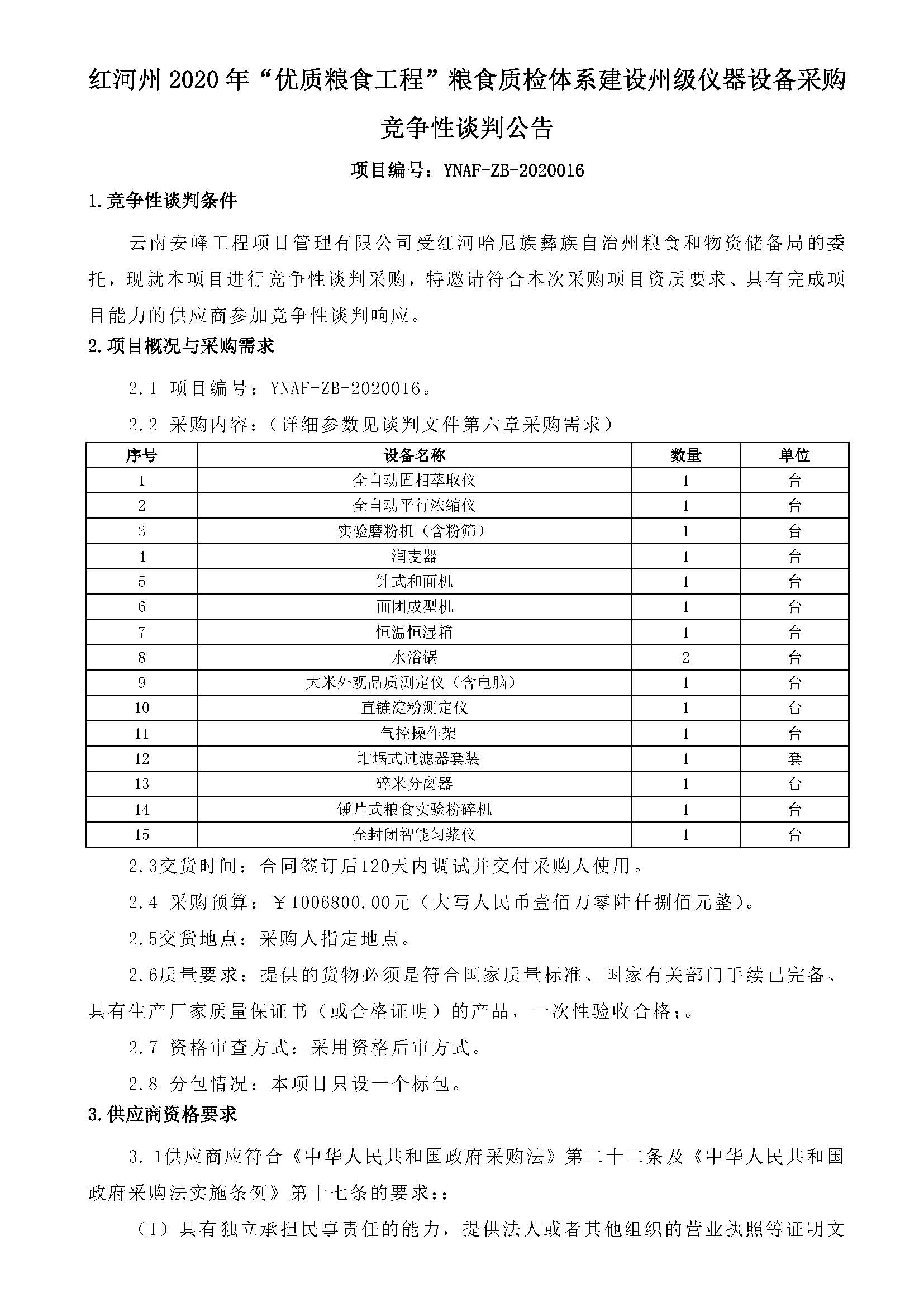 紅河州2020年“優(yōu)質糧食工程”糧食質檢體系建設州級儀器設備采購 競爭性談判公告