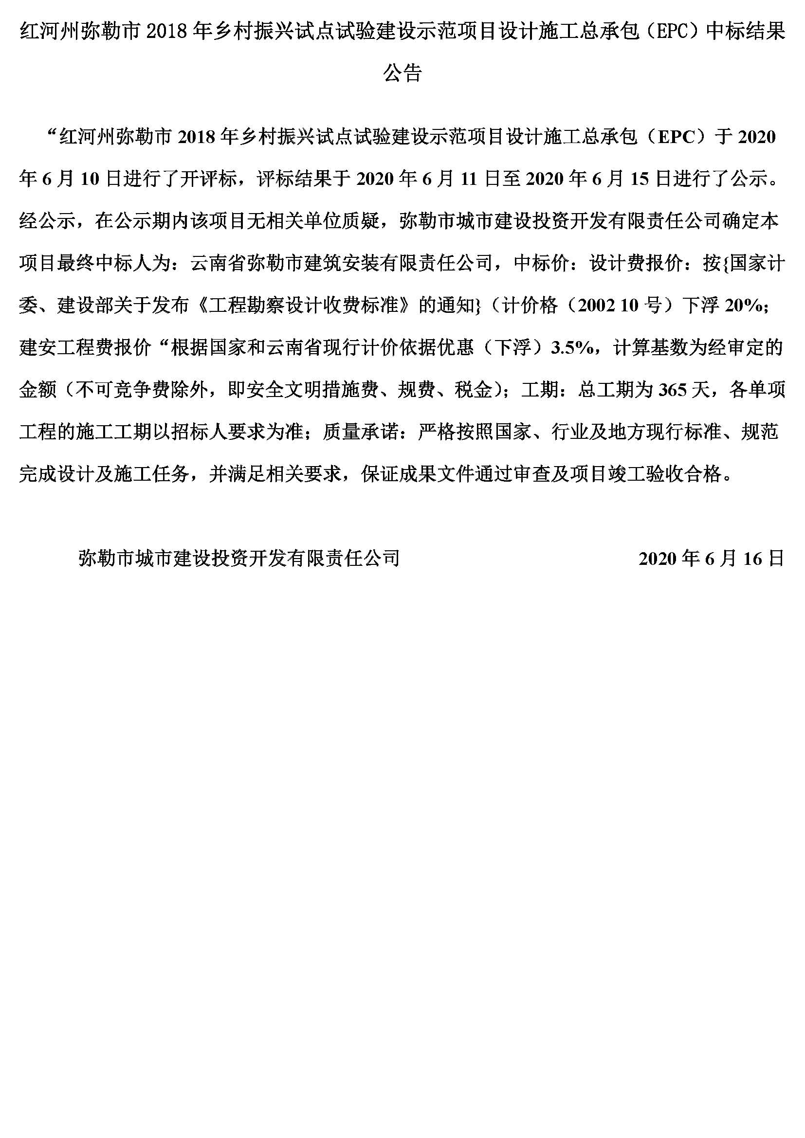 紅河州彌勒市2018年鄉(xiāng)村振興試點試驗建設(shè)示范項目設(shè)計施工總承包(EPC)中標(biāo)結(jié)果公告