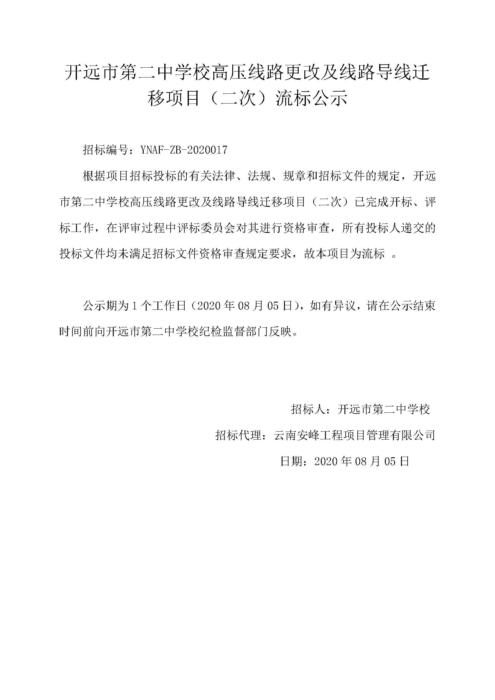 開遠市第二中學校高壓線路更改及線路導線遷移項目流標公示