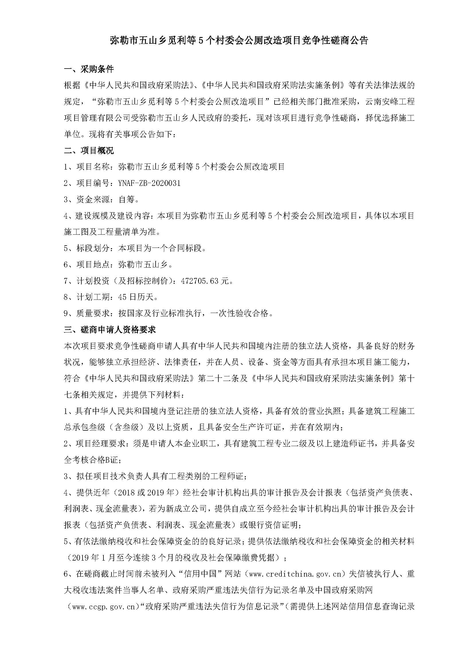 彌勒市五山鄉(xiāng)覓利等5個村委會公廁改造項目競爭性磋商公告