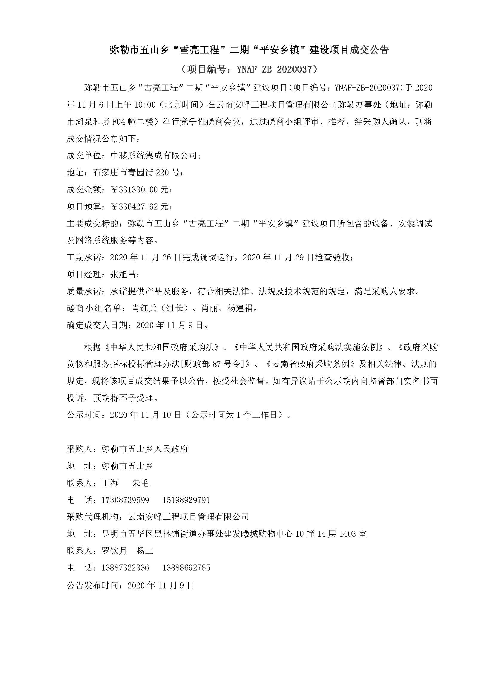 彌勒市五山鄉(xiāng)“雪亮工程”二期“平安鄉(xiāng)鎮(zhèn)”建設(shè)項(xiàng)目成交公告