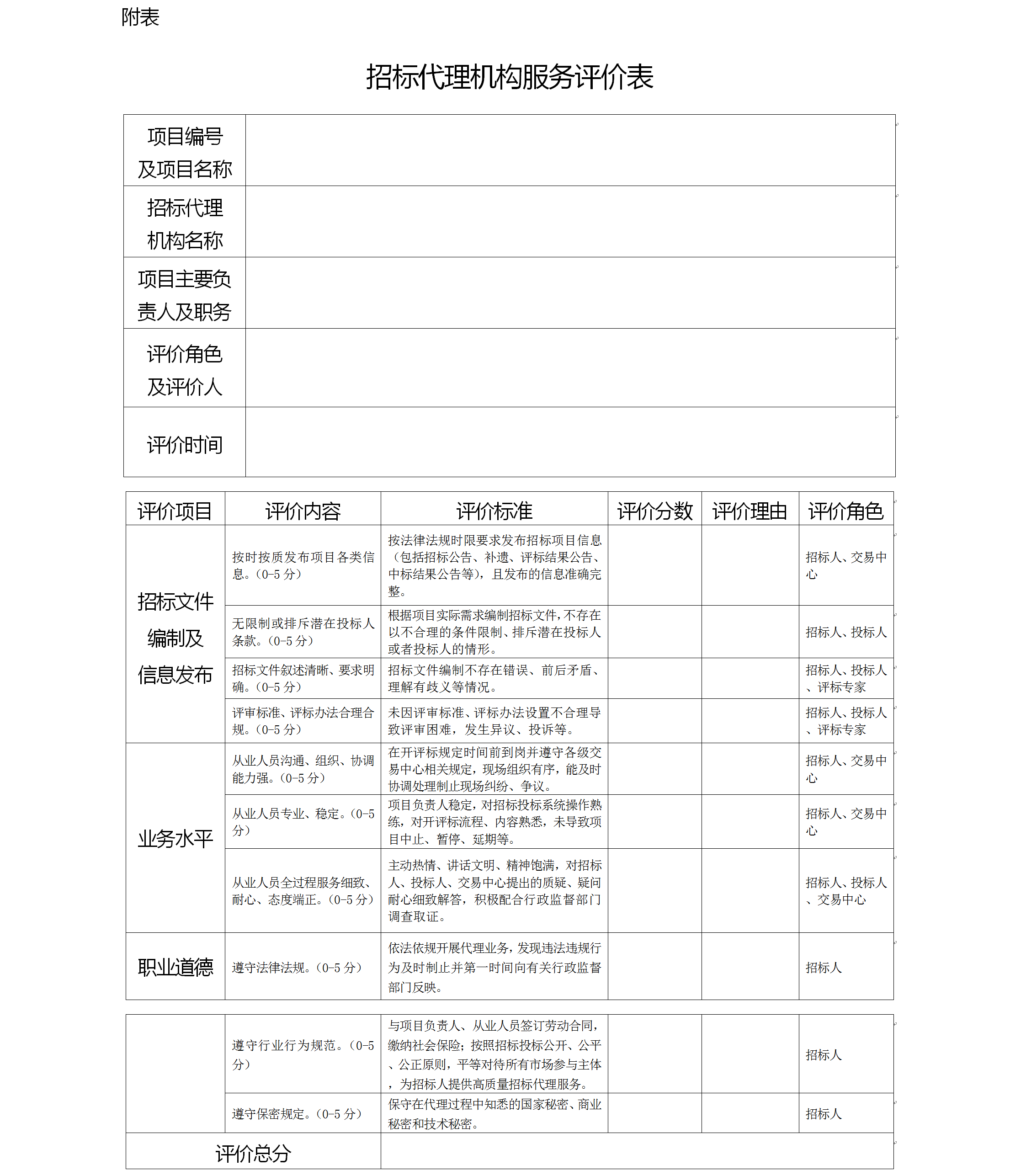 附表:招標(biāo)代理機(jī)構(gòu)服務(wù)評(píng)價(jià)表