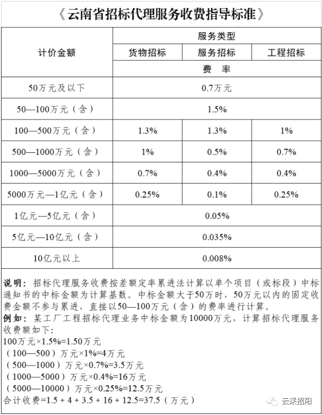 云南省招協(xié)于11月28日發(fā)布了《云南省建設(shè)工程招標(biāo)代理服務(wù)收費指導(dǎo)意見》的意見征求稿,云采招陽將征求意見稿的代理服務(wù)費計算部分與國家計委印發(fā)的《招標(biāo)代理服務(wù)收費管理暫行辦法》(計價格[2002]1980號)進(jìn)行了簡單對比,現(xiàn)正式印發(fā)后相關(guān)結(jié)論部分仍未變動,具體如下: