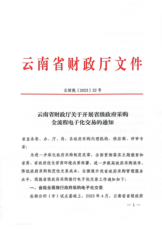 云南省財(cái)政廳關(guān)于開展省級政府采購全流程電子化交易的通知