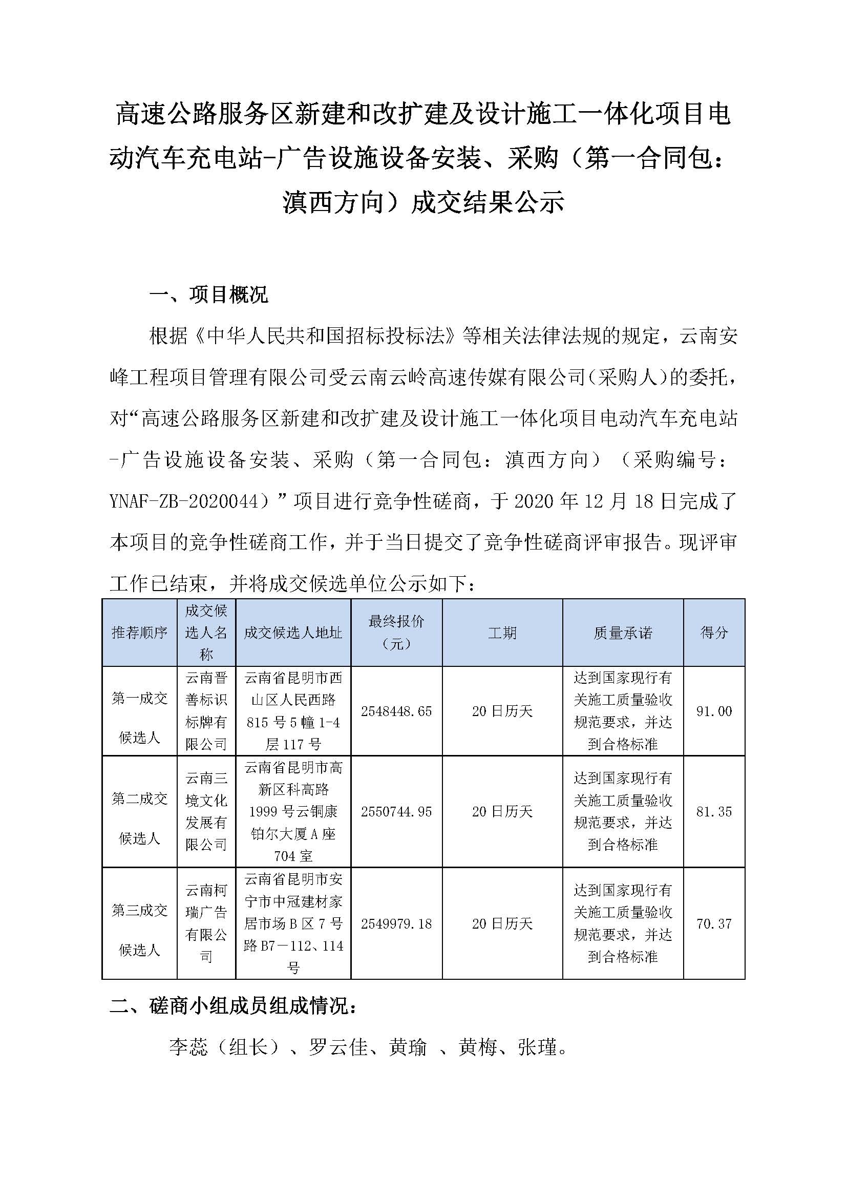 高速公路服務區(qū)新建和改擴建及設計施工一體化項目電動汽車充電站-廣告設施設備安裝、采購(第一合同包:滇西方向)成交結(jié)果公示