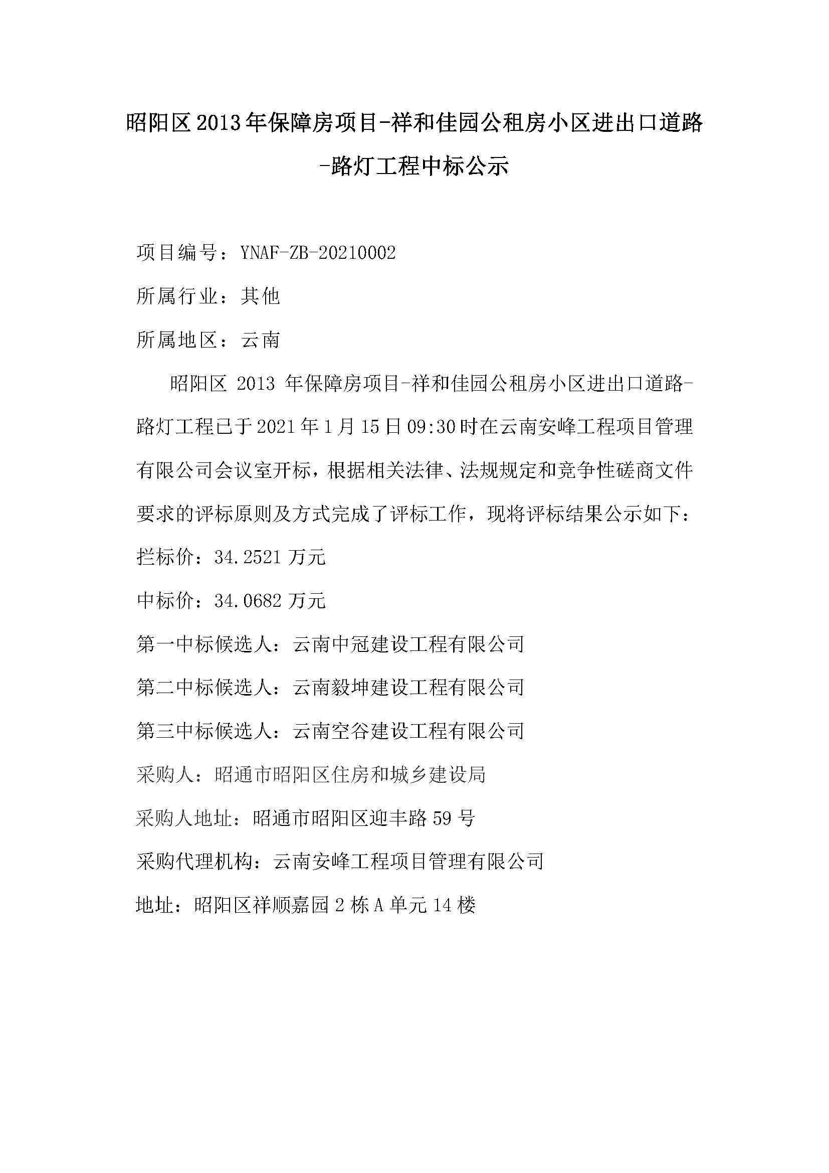 昭陽區(qū)2013年保障房項(xiàng)目-祥和佳園公租房小區(qū)進(jìn)出口道路-路燈工程中標(biāo)公示