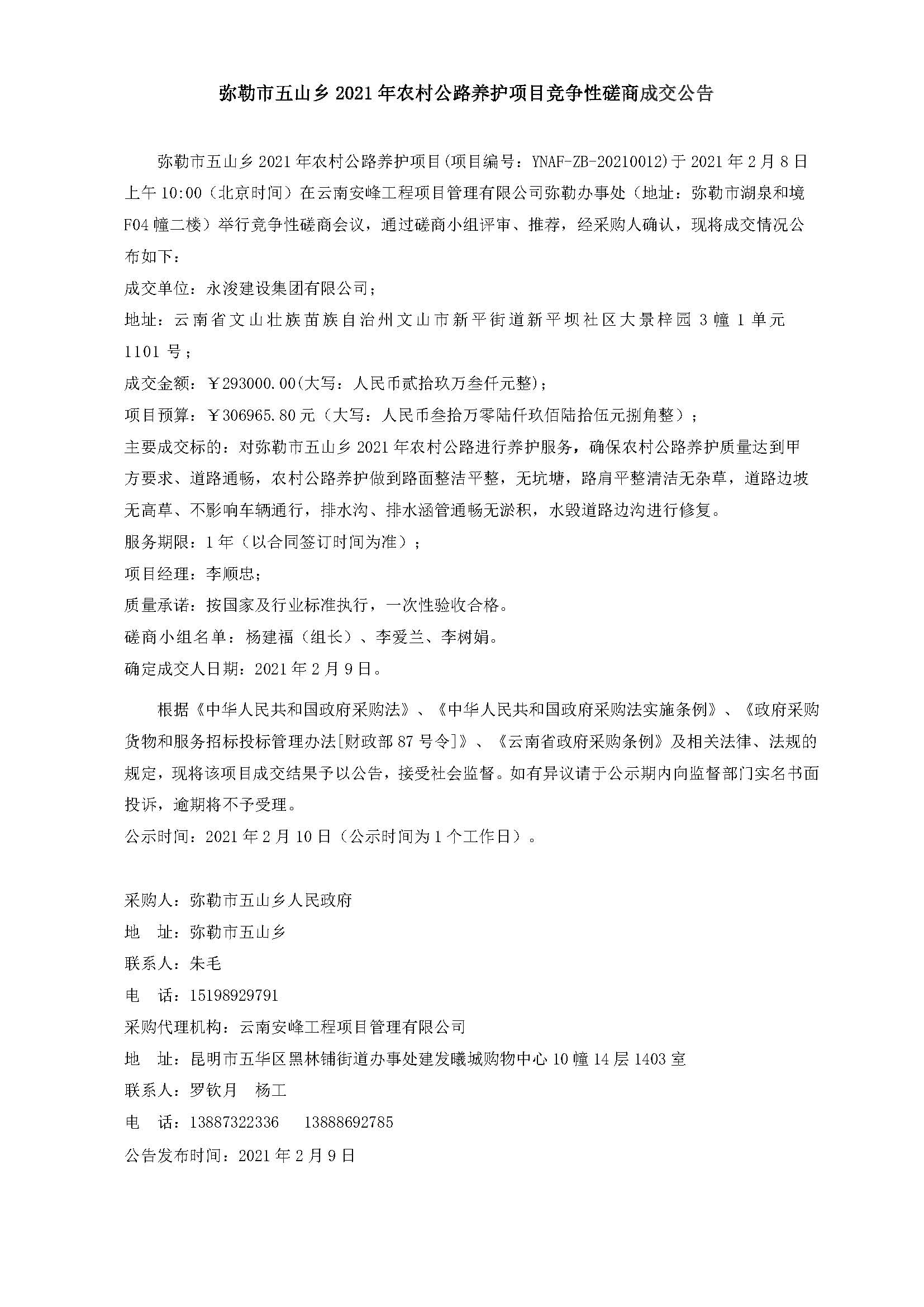 彌勒市五山鄉(xiāng)2021年農(nóng)村公路養(yǎng)護(hù)項目競爭性磋商成交公告