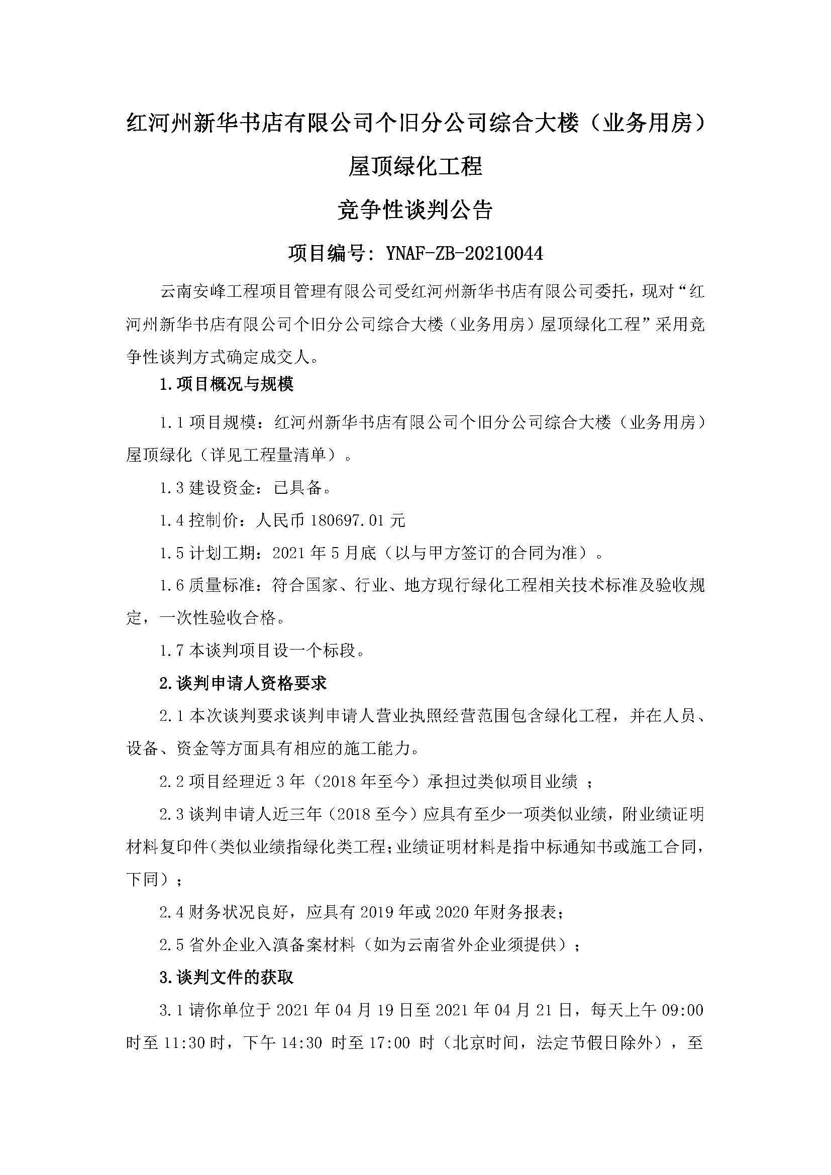 紅河州新華書店有限公司個舊分公司綜合大樓(業(yè)務用房)屋頂綠化工程競爭性談判公告