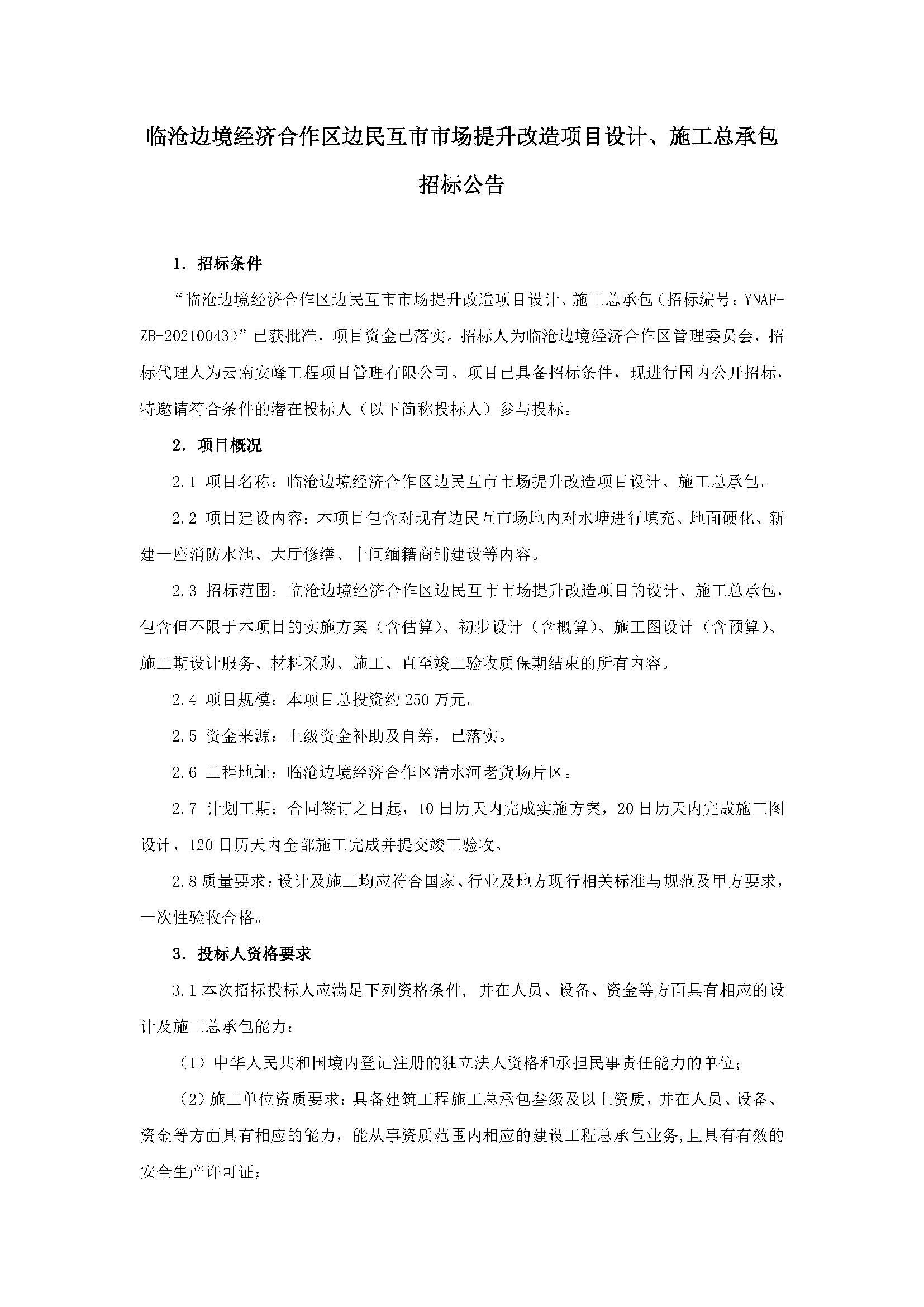 臨滄邊境經(jīng)濟合作區(qū)邊民互市市場提升改造項目設(shè)計、施工總承包招標(biāo)公告