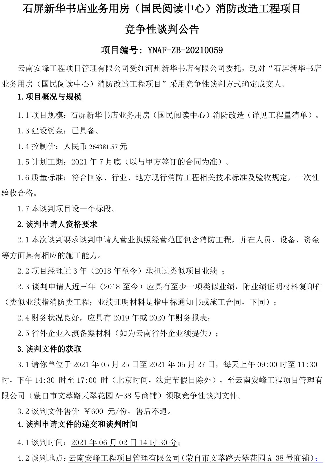 石屏新華書(shū)店業(yè)務(wù)用房(國(guó)民閱讀中心)消防改造工程項(xiàng)目競(jìng)爭(zhēng)性談判公告