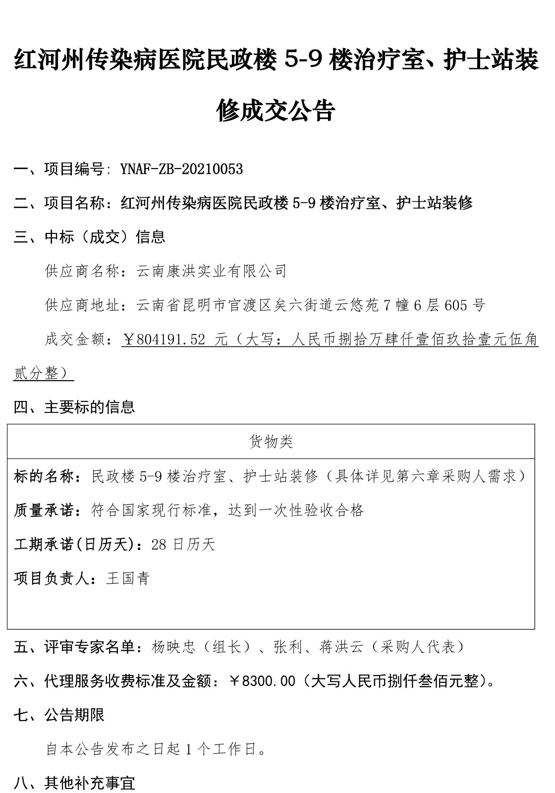 紅河州傳染病醫(yī)院民政樓5-9樓治療室、護(hù)士站裝修成交公告