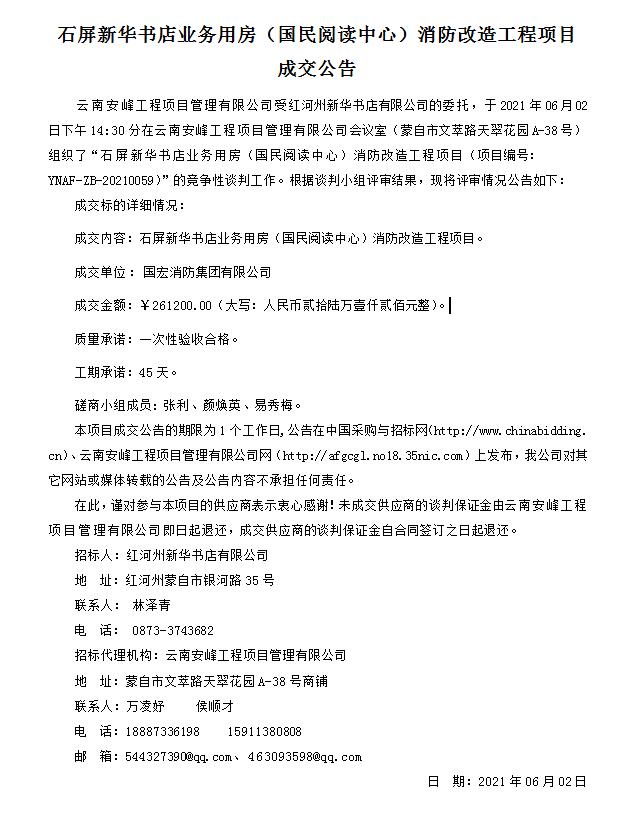 石屏新華書店業(yè)務用房(國民閱讀中心)消防改造工程項目成交公告