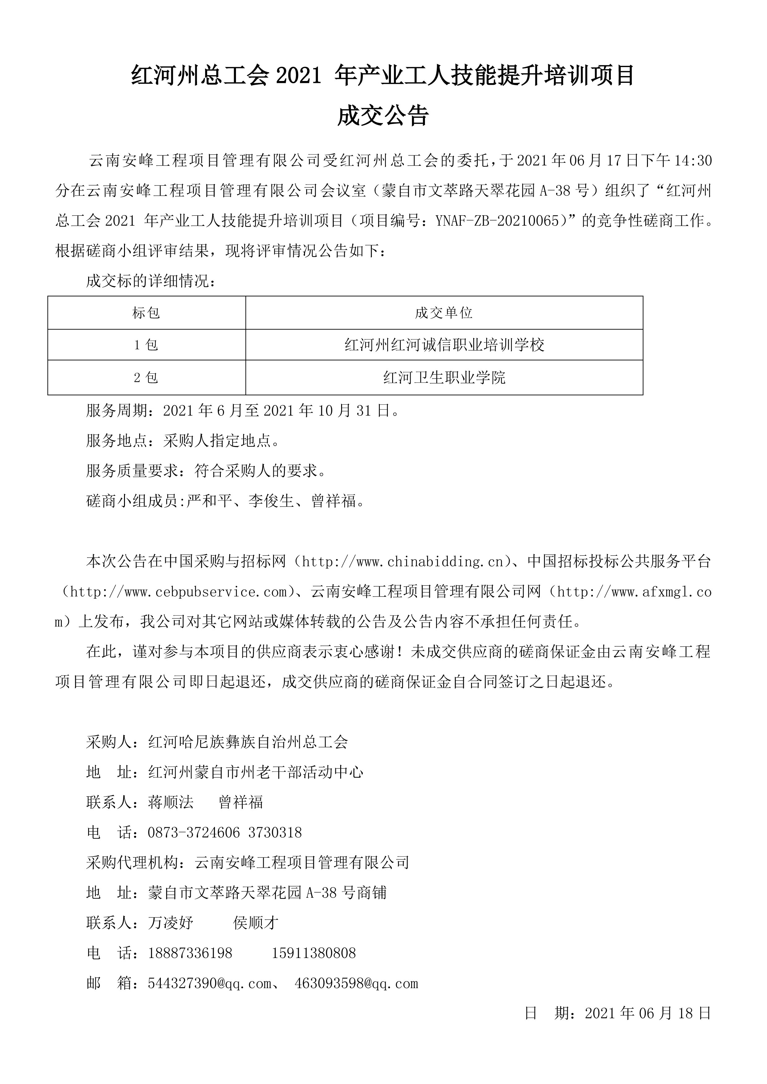 紅河州總工會(huì)2021 年產(chǎn)業(yè)工人技能提升培訓(xùn)項(xiàng)目成交公告