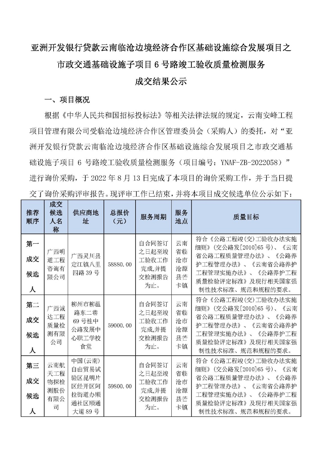 亞洲開發(fā)銀行貸款云南臨滄邊境經(jīng)濟(jì)合作區(qū)基礎(chǔ)設(shè)施綜合發(fā)展項(xiàng)目之市政交通基礎(chǔ)設(shè)施子項(xiàng)目6號(hào)路竣工驗(yàn)收質(zhì)量檢測(cè)服務(wù)
