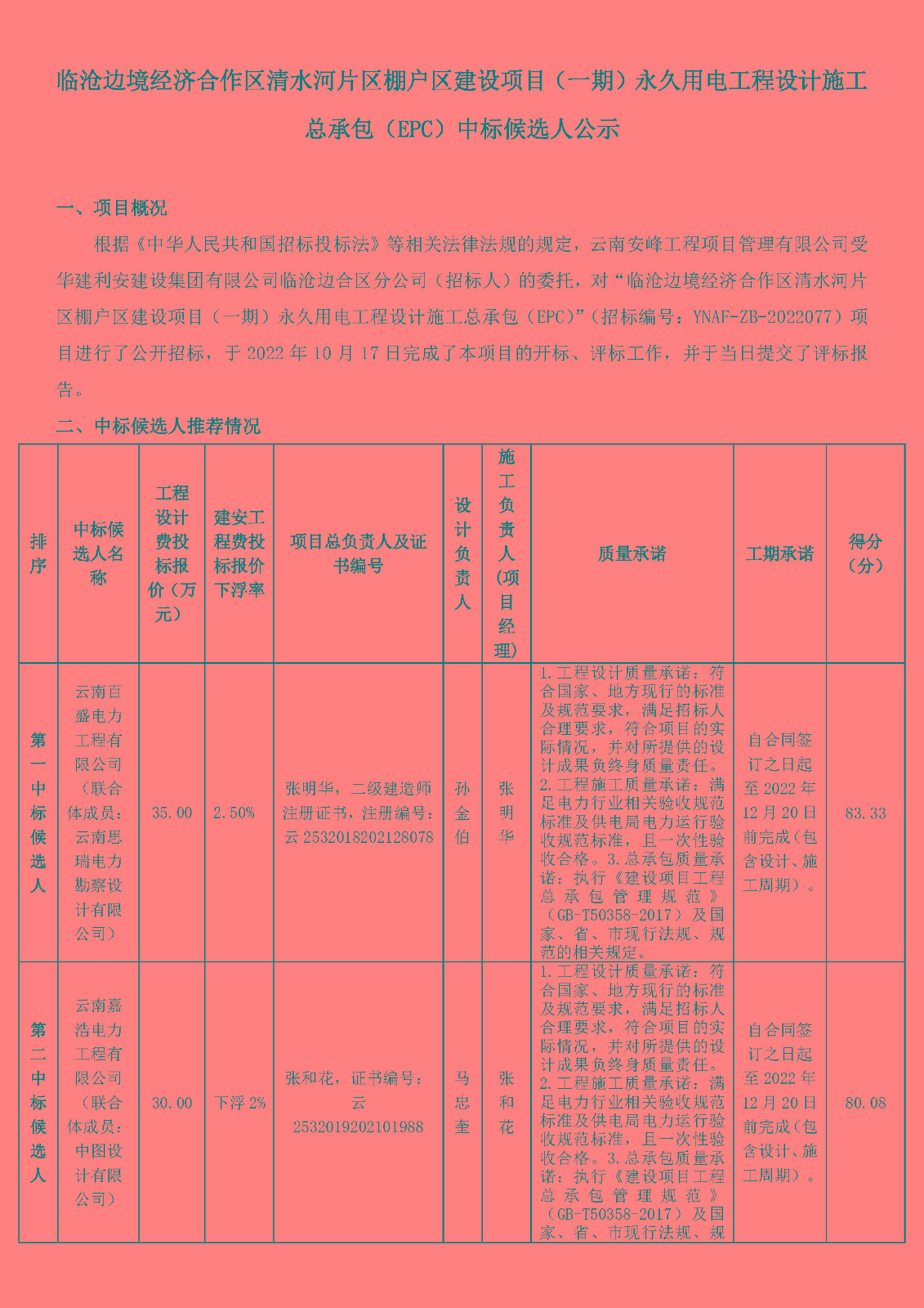 臨滄邊境經(jīng)濟(jì)合作區(qū)清水河片區(qū)棚戶(hù)區(qū)建設(shè)項(xiàng)目(一期)永久用電工程設(shè)計(jì)施工總承包(EPC)中標(biāo)結(jié)果公示