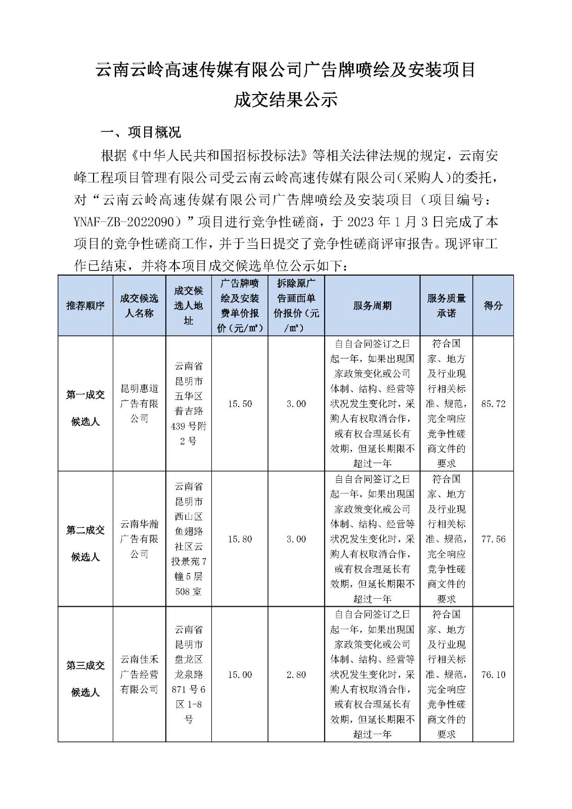 云南云嶺高速傳媒有限公司廣告牌噴繪及安裝項目成交結果公示