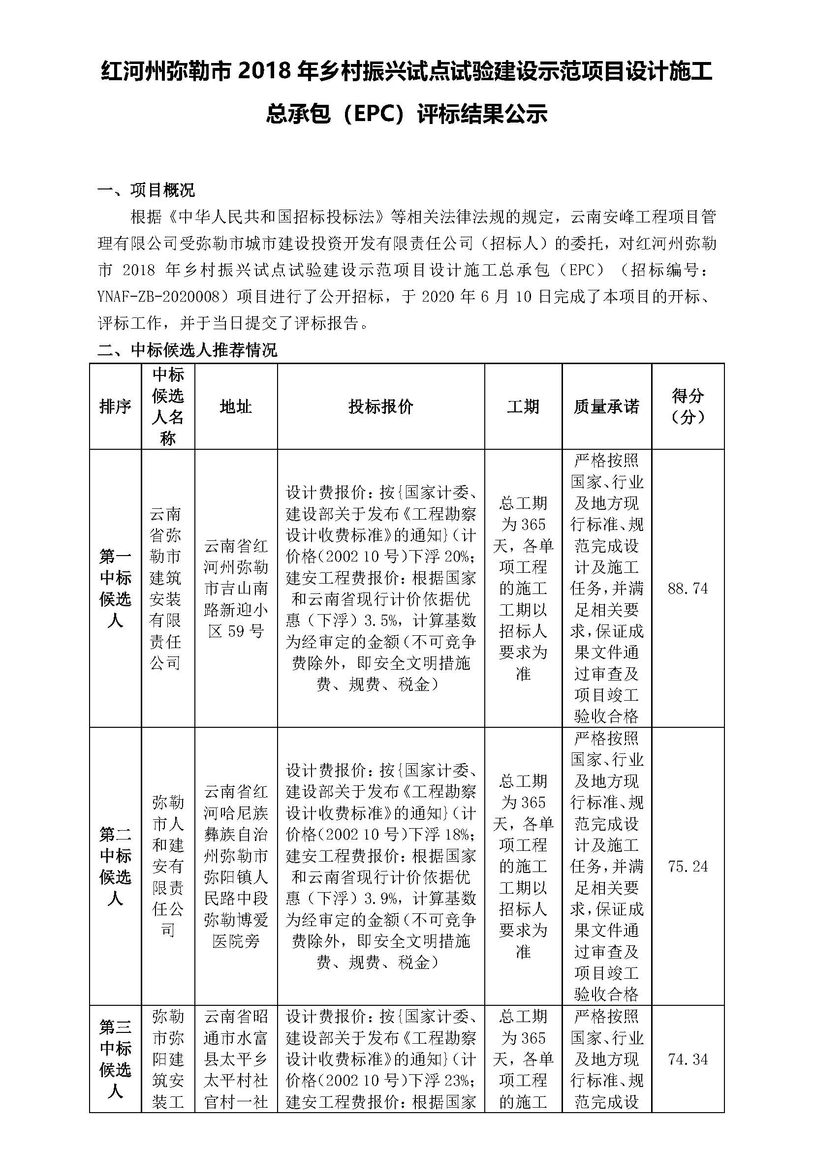 紅河州彌勒市2018年鄉(xiāng)村振興試點(diǎn)試驗建設(shè)示范項目設(shè)計施工總承包(EPC)評標(biāo)結(jié)果公示