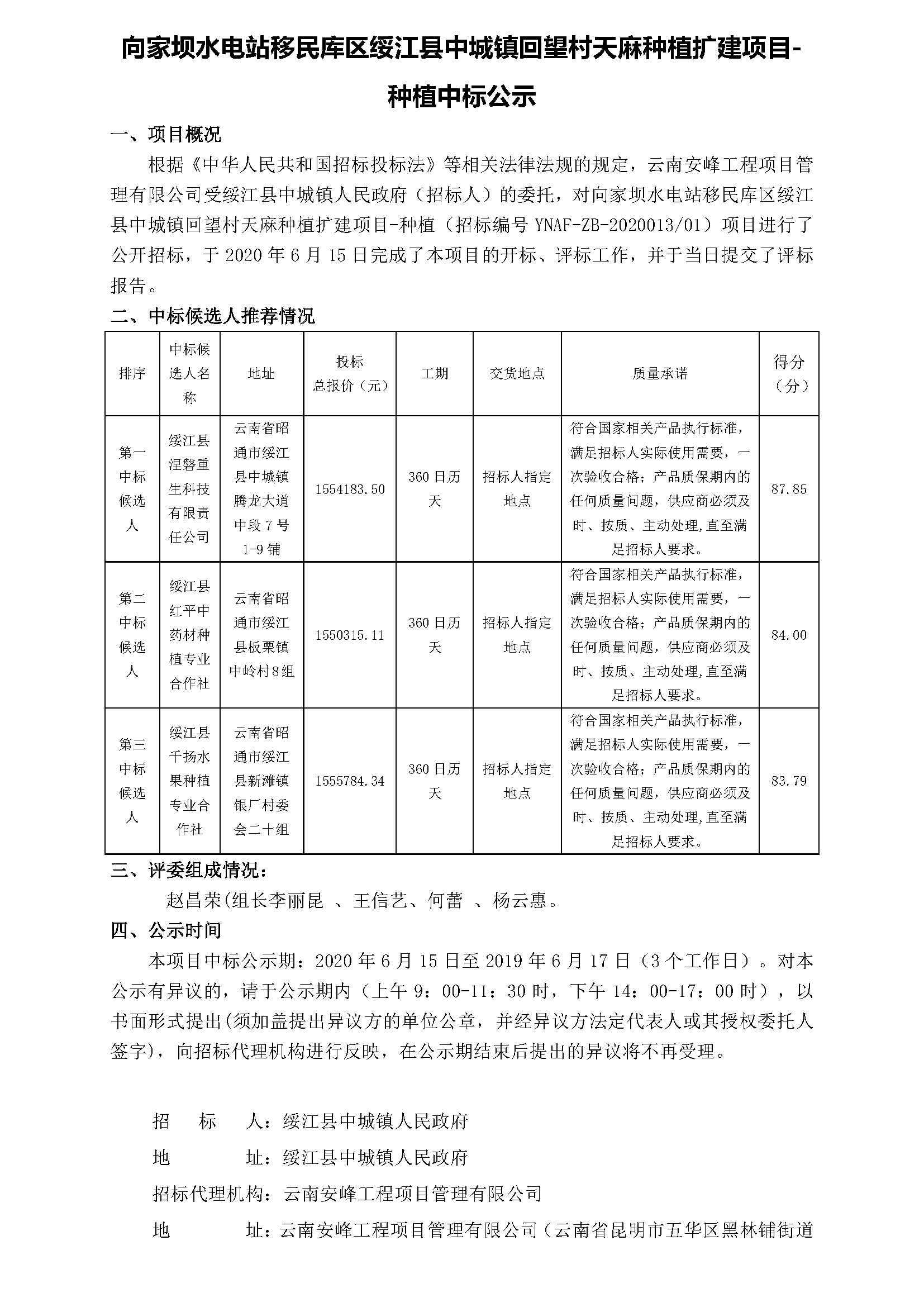 向家壩水電站移民庫區(qū)綏江縣中城鎮(zhèn)回望村天麻種植擴(kuò)建項(xiàng)目-種植中標(biāo)公示
