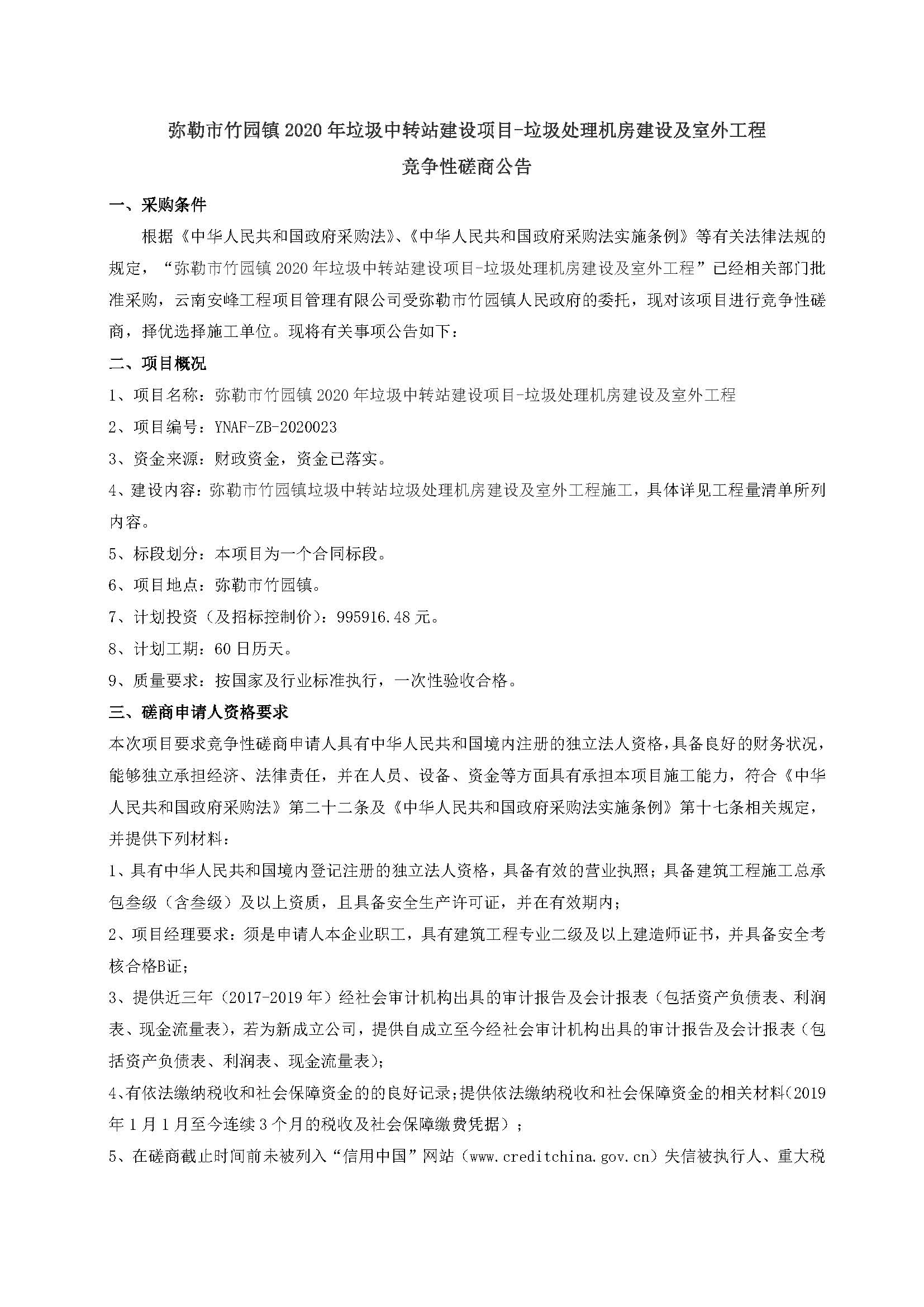 彌勒市竹園鎮(zhèn)2020年垃圾中轉站建設項目-垃圾處理機房建設及室外工程 競爭性磋商公告