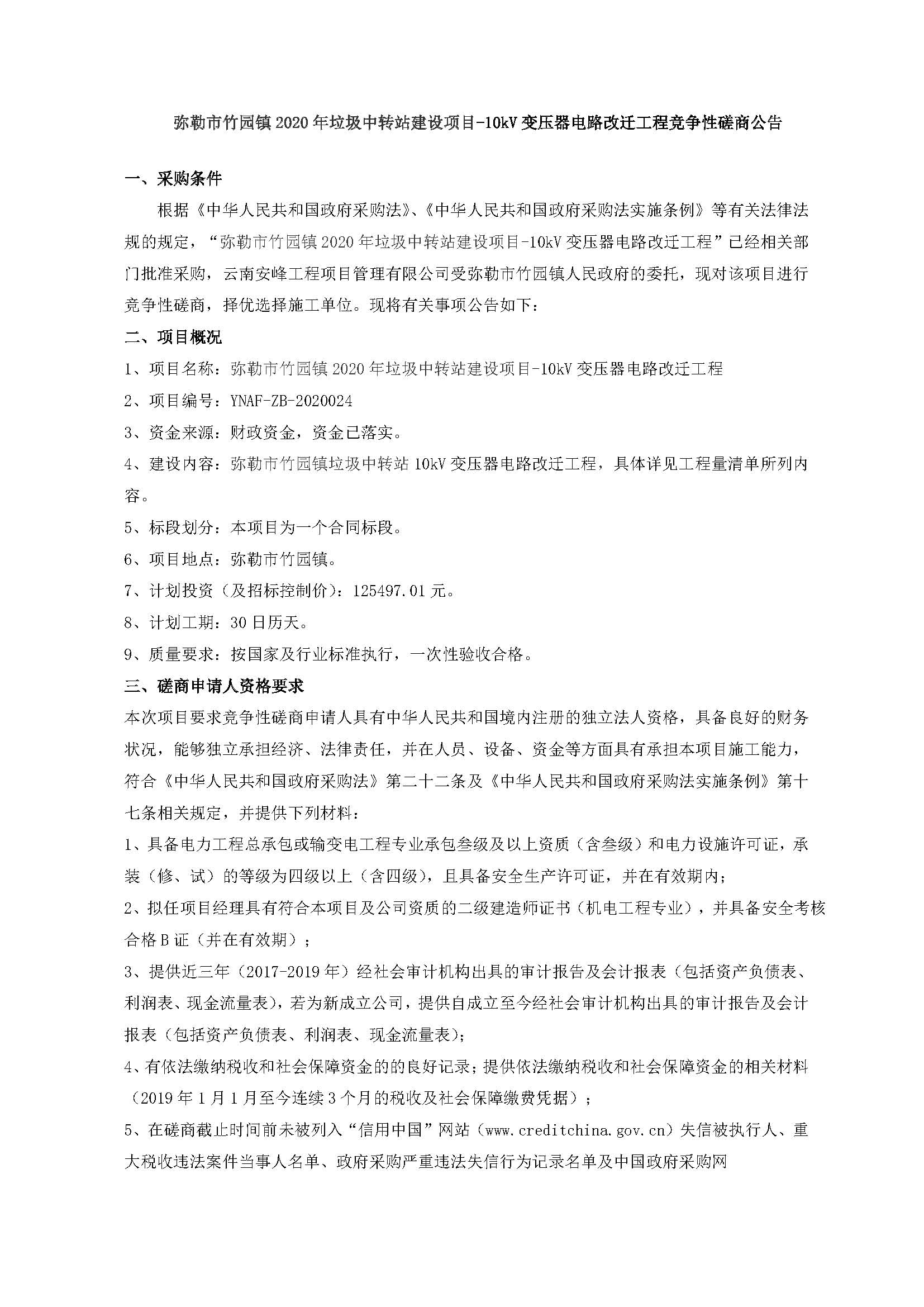 彌勒市竹園鎮(zhèn)2020年垃圾中轉(zhuǎn)站建設(shè)項目-10kV變壓器電路改遷工程競爭性磋商公告