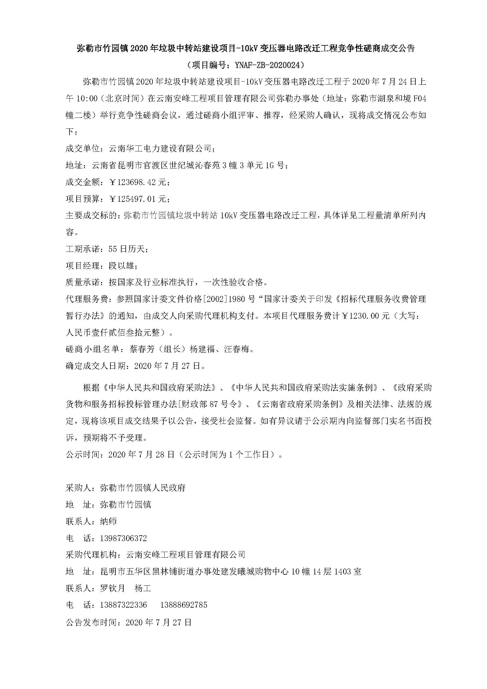 彌勒市竹園鎮(zhèn)2020年垃圾中轉(zhuǎn)站建設(shè)項目-10kV變壓器電路改遷工程競爭性磋商成交公告