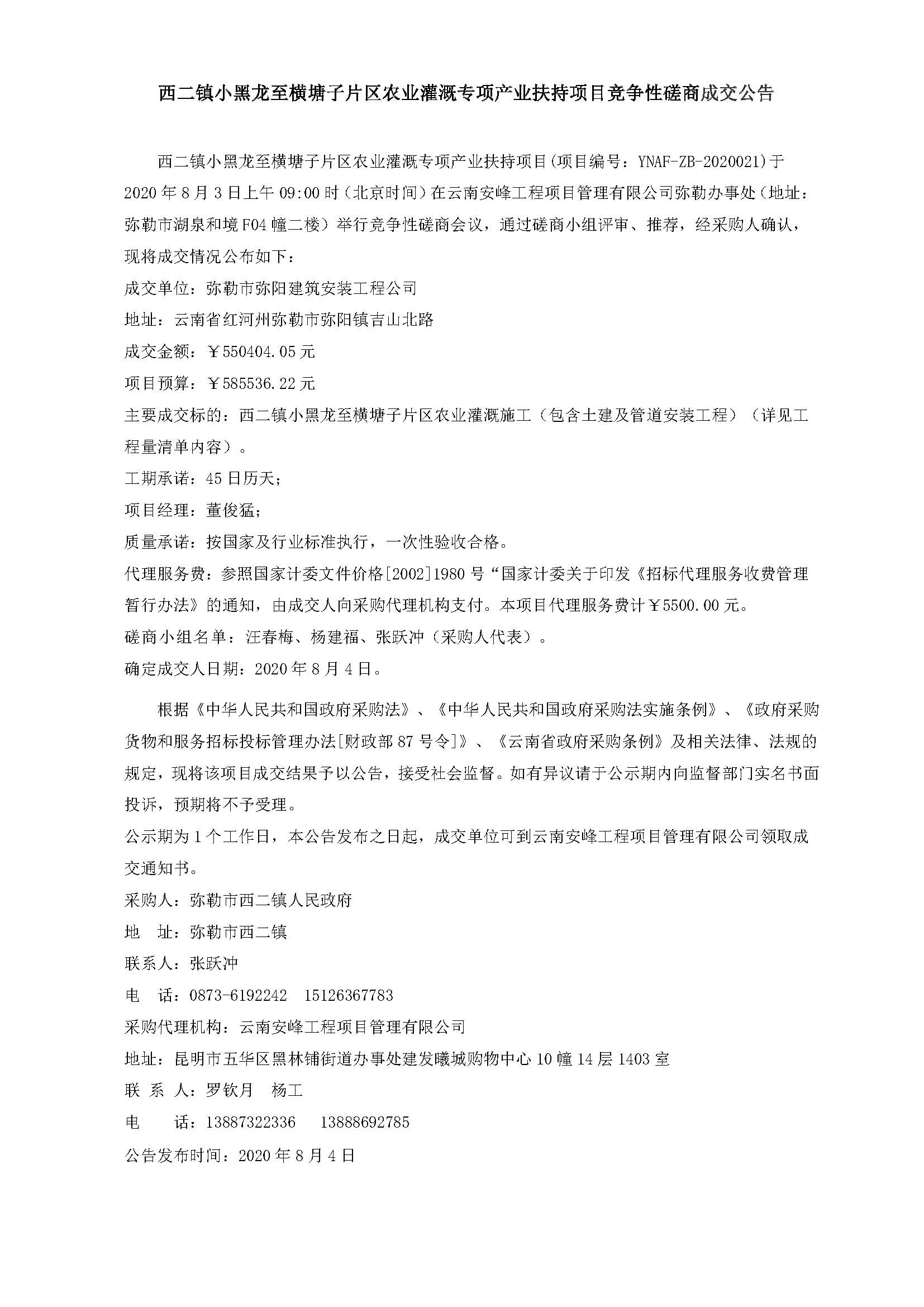 西二鎮(zhèn)小黑龍至橫塘子片區(qū)農(nóng)業(yè)灌溉專項(xiàng)產(chǎn)業(yè)扶持項(xiàng)目競(jìng)爭(zhēng)性磋商成交公告