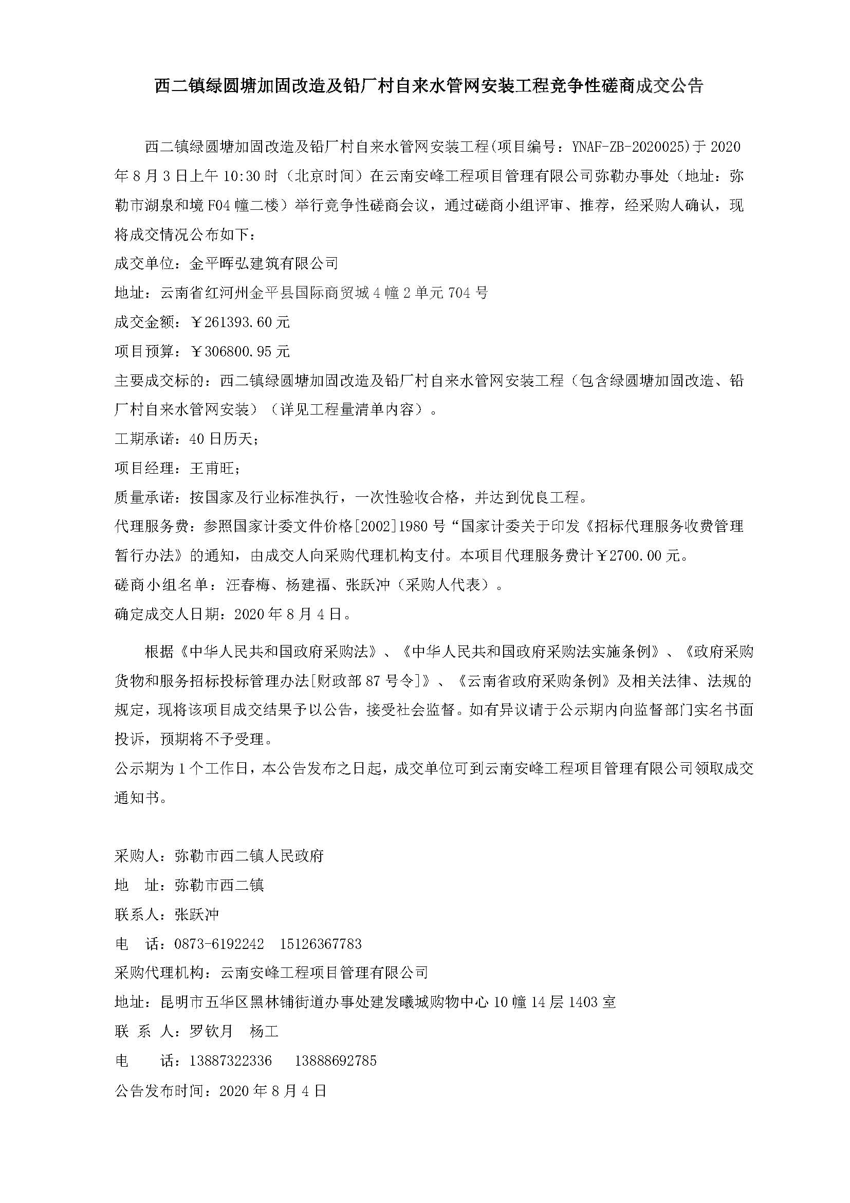 西二鎮(zhèn)綠圓塘加固改造及鉛廠村自來水管網(wǎng)安裝工程競(jìng)爭(zhēng)性磋商成交公告