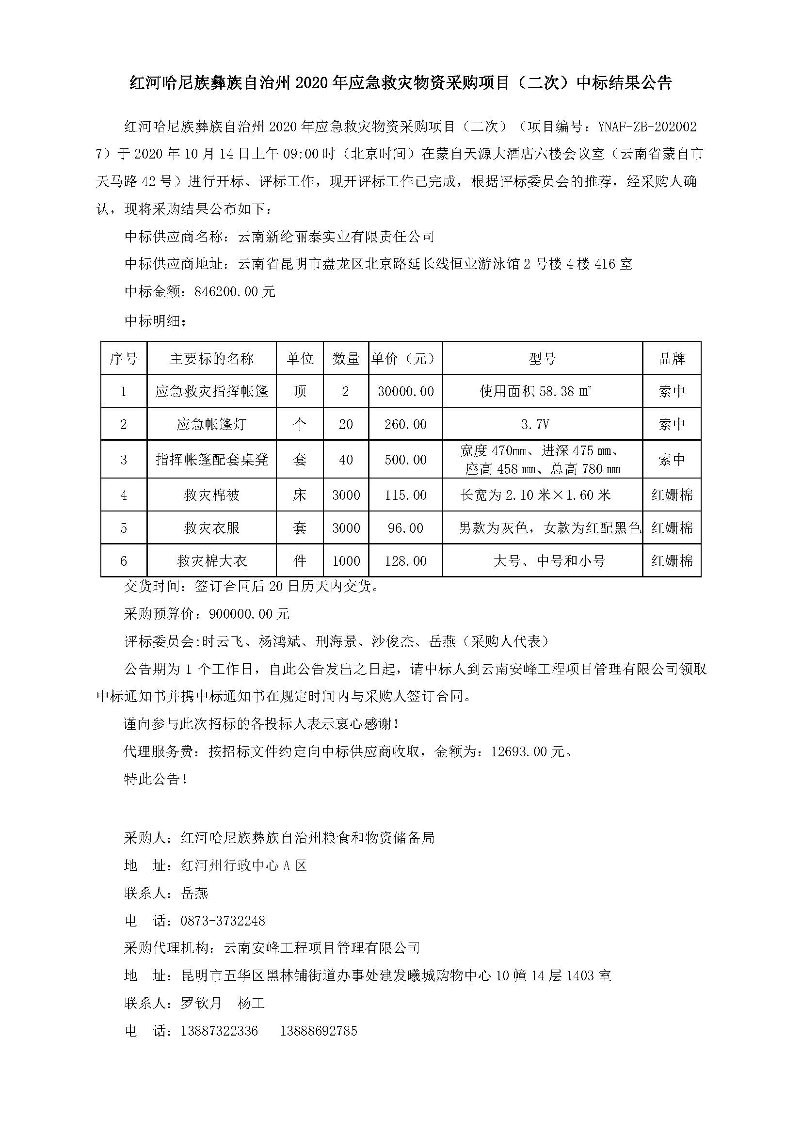 紅河哈尼族彝族自治州2020年應(yīng)急救災(zāi)物資采購(gòu)項(xiàng)目(二次)中標(biāo)結(jié)果公告